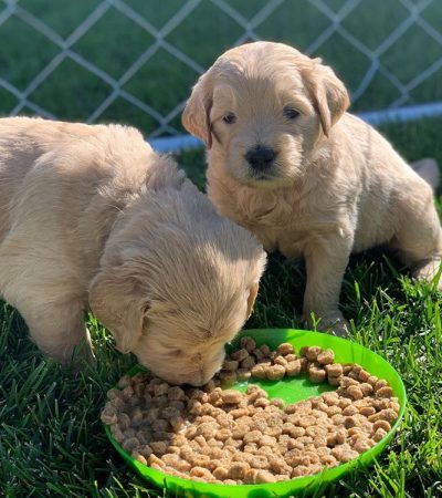 On the farm, the puppies are in their crates at 9:30 pm and they wake up around 6-7 am. The first thing I do when they wake up is take them right out to the bathroom and prepare their breakfast. I give them their food and water for 15 minutes at each meal time and if they haven’t finished it, that’s ok, I still take it away. They will learn fast that meal time is time to eat, not play.
